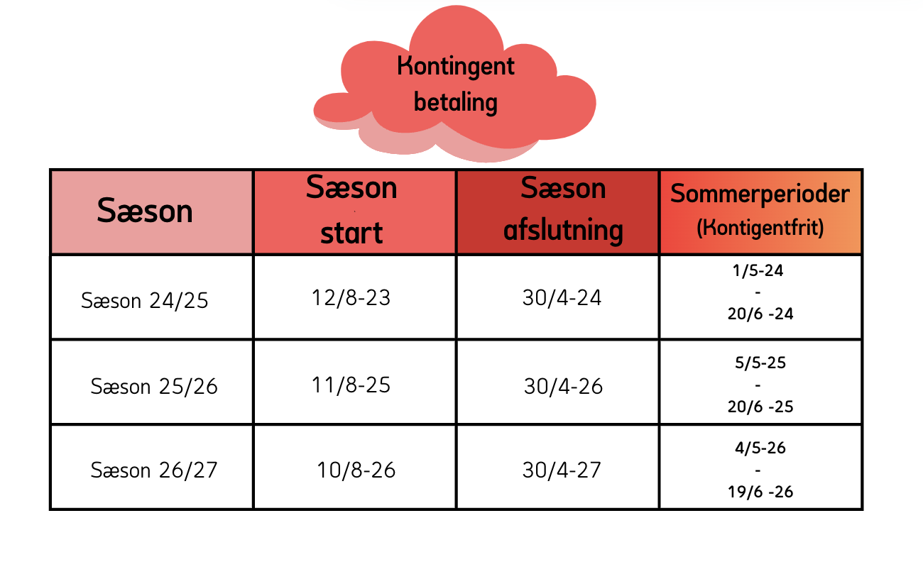 Kontingentfri periode : 1. maj – 20. Juni (sommerperiode). I denne periode vil træningstiderne gældende fra August bliver tilgængelige. Det kan medføre ændringer i tider og dage for de pågældende hold.